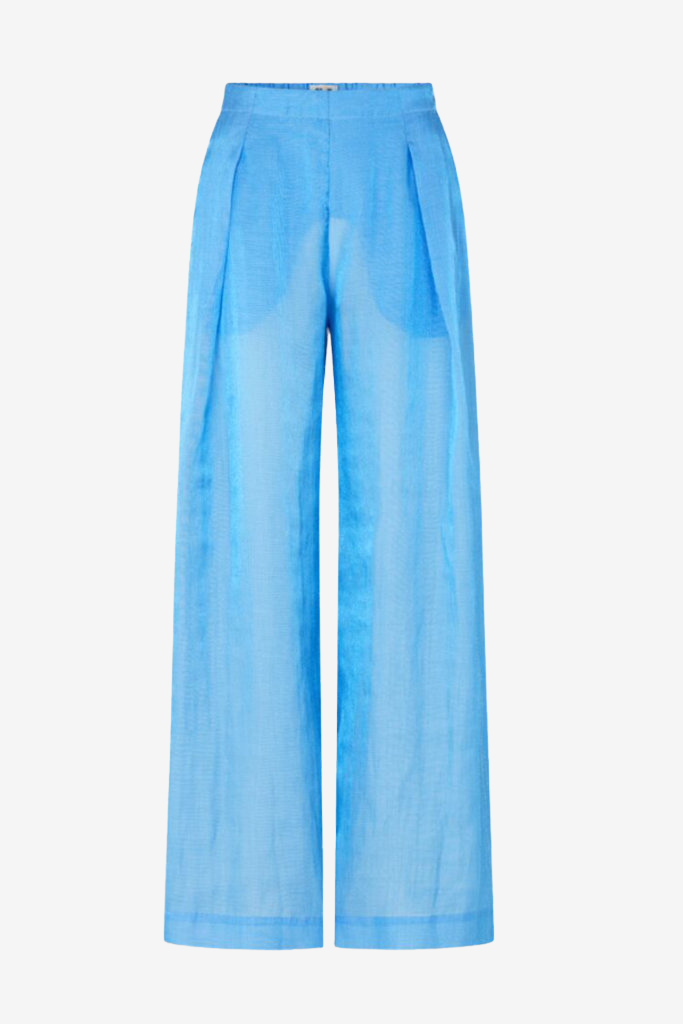 Create an accountThe Baum und Pferdgarten Nalda Trousers in Little Boy Blue deliver both style and sustainability. Made from a light, semi-sheer Tencel blend (54% Tencel, 46% polyester), these pleated trousers offer graceful volume with a floaty wide-leg silhouette. The high elastic waistband and soft 100% viscose lining ensure comfort from day to night. Functional slash pockets and patch back pockets add structure and easy elegance. The model is 1.77 m tall, wears size 36 (Small), and the fit is true to size.