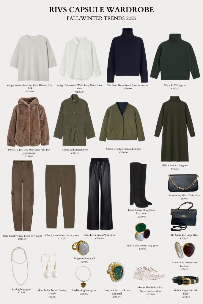 De herfst/wintercollectie van 2025 bij RIVS draait om rijke materialen, slimme laagjes en kleurcombinaties die de tand des tijds doorstaan. Eén van de mooiste combinaties dit seizoen? Groen & ecru.