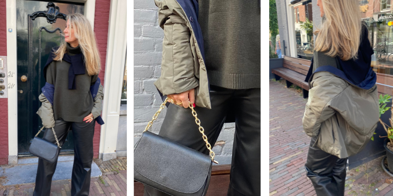 Deze look draait om rijke materialen en zachte tinten, perfect voor een avondje uit of een stijlvolle dag in de stad. De basis is de Zenggi Amsterdam Fine Wool Dawson top in chalk, een licht en luxueus knitwear-item dat prachtig contrasteert met de Ibana Phoeby suède broek in olive night. De high waist, cargozakken en verstelbare pijpen geven deze broek een stoer, maar toch verfijnd karakter.