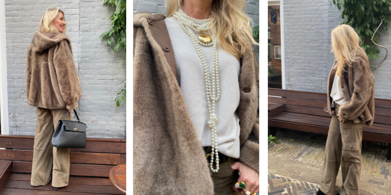 Daarover draag je de Pride To Be Hovy New Mink fake fur jacket in moka – een jas die instant luxe en warmte uitstraalt. De By Malene Birger Safa riem met gouden gesp accentueert subtiel de taille en voegt extra verfijning toe.