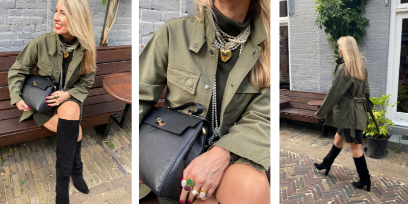 Deze look ademt klassieke vrouwelijkheid met een vleugje stoer. De basis is de groene Allude A-lijn jurk van een luxueuze wol- en cashmeremix – elegant vallend en heerlijk zacht op de huid. Daaroverheen draag je de Closed parka in forest green, uitgevoerd in zachte cotton chino satin met subtiele heritage details. Een jas die moeiteloos de brug slaat tussen casual en chic.