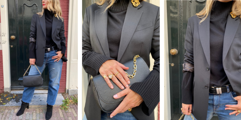 We starten met de Closed Jeans Milo 5N Mid Blue en de zachte koltrui van Majestic Filatures als comfortabele basis. Daarover draag je de gestructureerde Davina Blazer van Filippa K voor een elegante, vrouwelijke touch.