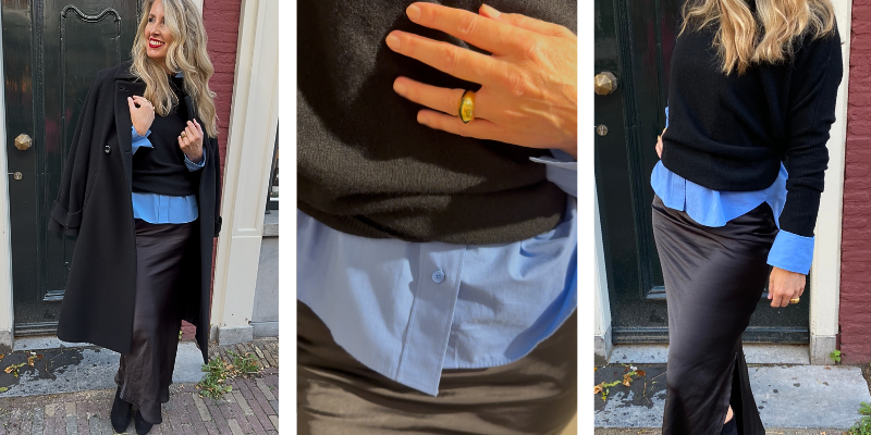 Een perfecte herfstlook begint met slimme lagen en contrasten in textuur. Deze outfit speelt met het klassieke kleurenspel van zwart en blauw, en geeft het een moderne, vrouwelijke twist.