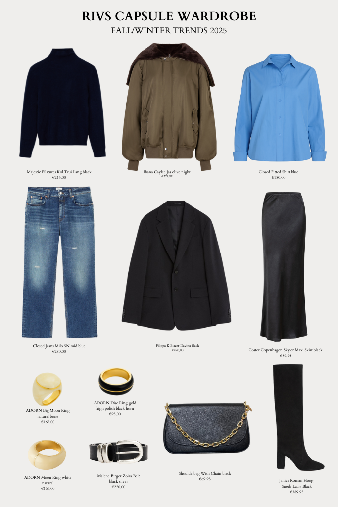 De kracht van een capsule wardrobe zit in de veelzijdigheid: met slechts enkele goed geselecteerde items, zoals de blauwe, groene en zwarte stukken uit onze FW25-collectie, stel je moeiteloos stijlvolle herfstlooks samen. Van modern minimalistisch tot stoer en verfijnd — deze diepe, koele tinten vormen een krachtige en serene basis voor elke gelegenheid. Zo kies je bewust voor rust, kwaliteit én uitstraling. Precies waar we bij RIVS voor staan.