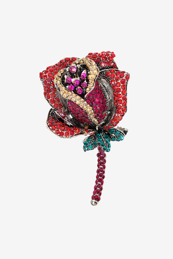 The RIVS Broche Roos is a refined statement piece designed to stand out. The floral silhouette is richly embellished with sparkling red, pink and subtle gold-toned stones, creating a playful yet luxurious composition. Green accents at the leaf and dark metal detailing enhance its elegant finish.