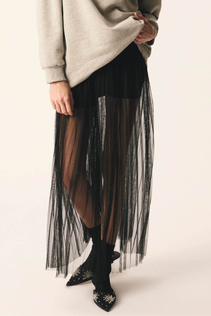 Create an accountThe Des Petits Hauts Tempo Skirt in black is a refined pleated skirt made from airy, sheer tulle with an elegant, feminine feel. It comes with a separate black underskirt, designed to be worn underneath for comfort and coverage. The softly flowing pleats create a flattering A-line silhouette, and the elasticated waistband ensures a comfortable fit. Pair with a chunky sweater for a casual look, or with a silky blouse and heels for a more dressed-up vibe.