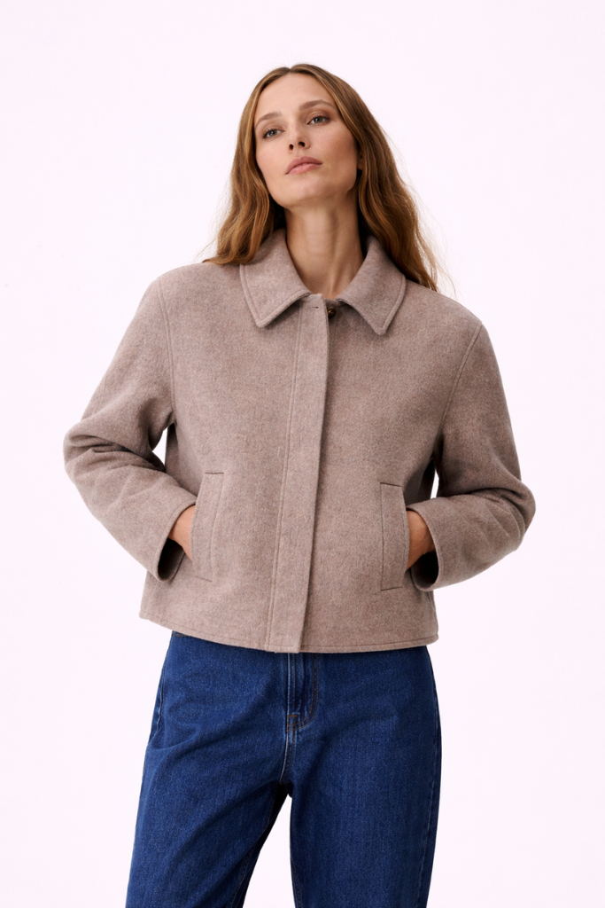 With a classic collar, long sleeves, and cropped straight fit, this jacket adds a touch of Parisian charm to your seasonal wardrobe. The soft latte tone makes it effortlessly pairable with light denim, flowy skirts or summer linen trousers.