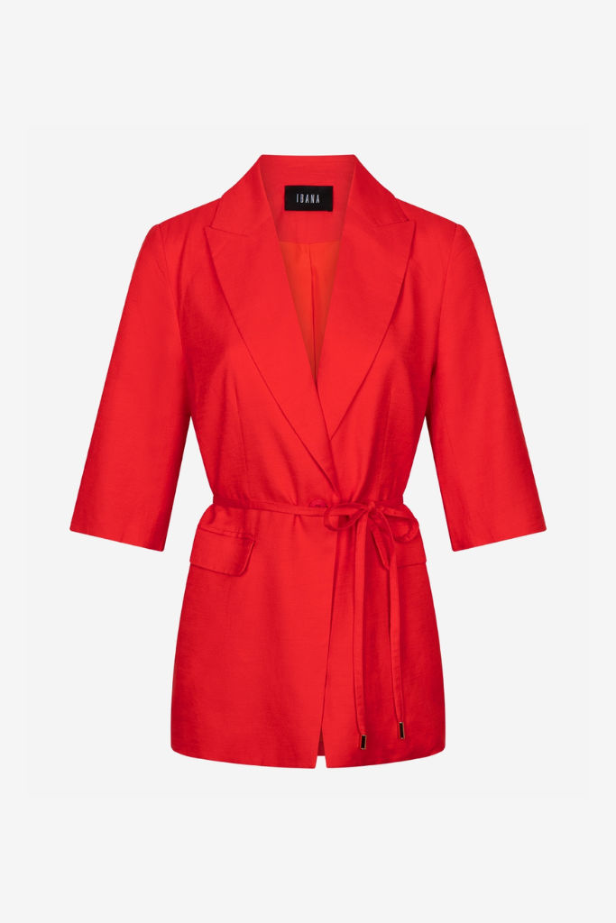 The Ibana Jelsa Blazer rosa coral is a true standout piece for the new season. Made from 100% polyester with a subtle sheen and texture, this blazer feels light and fluid. The feminine silhouette is enhanced by the matching waist belt, allowing you to wear it open or cinched. The three-quarter sleeves and straight cut add a modern, airy vibe.