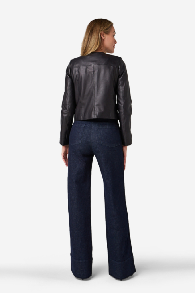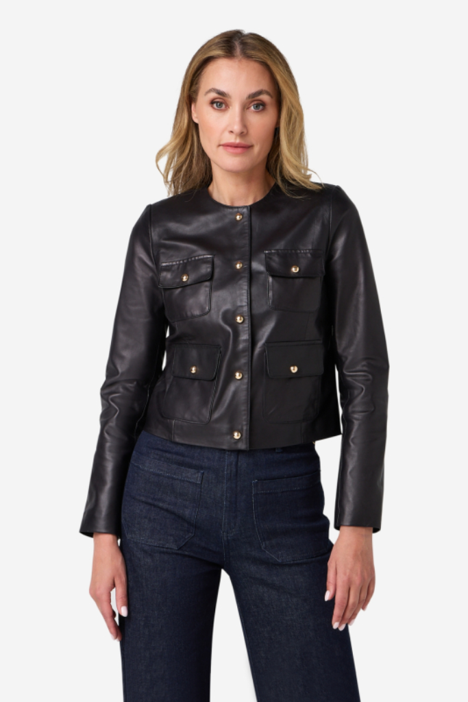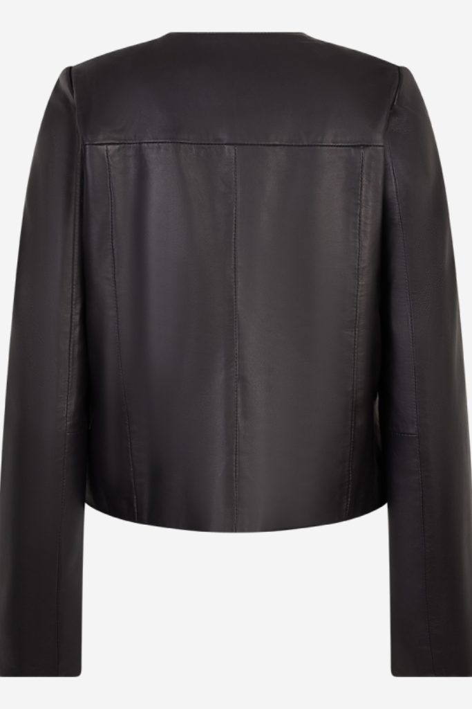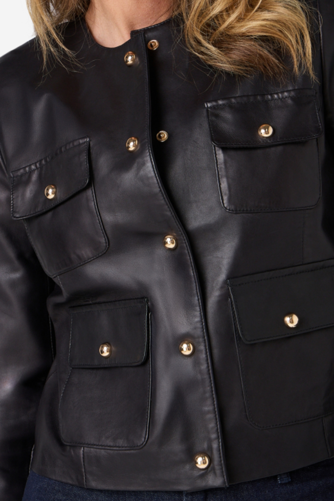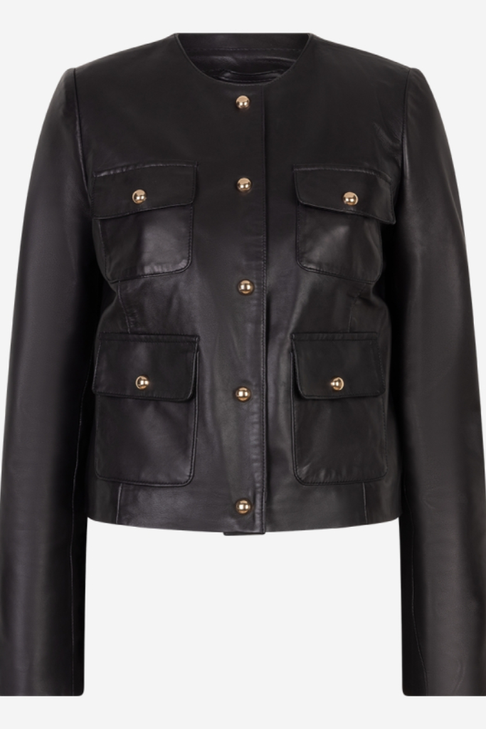 Create an accountThe Ibana Jenny Leather Jacket Black is a luxurious, timeless statement piece that adds a powerful and stylish edge to any outfit. Crafted from premium, supple black leather, it offers a soft touch while maintaining a structured silhouette. The four flap pockets with gold-tone buttons provide a striking, chic detail, while the straight fit and round neckline create a modern, minimalist look. With its impeccable craftsmanship, this leather jacket is both durable and versatile: wear it open over jeans and a T-shirt for a casual vibe or buttoned up for an elegant, polished style. Perfect for the autumn/winter season, yet also a bold layering choice for spring. Fit is true to size.