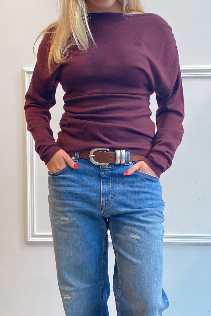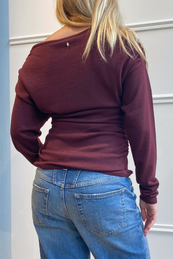 Create an accountThe Ibana Kami Sweater in burgundy is a refined knit crafted from 100% pure wool. This luxurious fabric feels soft against the skin while keeping you warm without sacrificing style. The sweater features subtle pleats at the shoulders and on the right side at the waist, adding a playful yet elegant touch. On the left side, it’s slightly tailored to create a feminine silhouette. The deep burgundy hue gives the sweater a rich, warm appeal that’s perfect for the autumn/winter season. Pair it casually with jeans or dress it up with tailored trousers or a leather skirt for a chic look. Fit is true to size, with a length that falls at the hip.