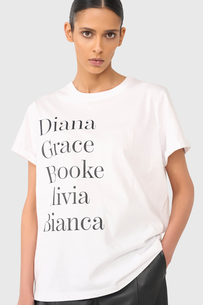 The Janice Rock Studio 54 T-shirt in white is a bold, stylish essential with personality. Crafted from high-quality cotton, it features a relaxed fit and classic round neckline. The graphic print of female names – like Diana, Grace and Bianca – subtly pays tribute to iconic women and timeless strength.