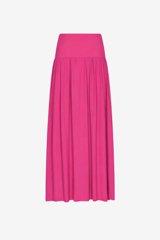 The Japan TKY Bakana Skirt rose sorbet, an airy maxi skirt in travel fabric with pleated panels and a wide elastic waistband that moves beautifully with your body.