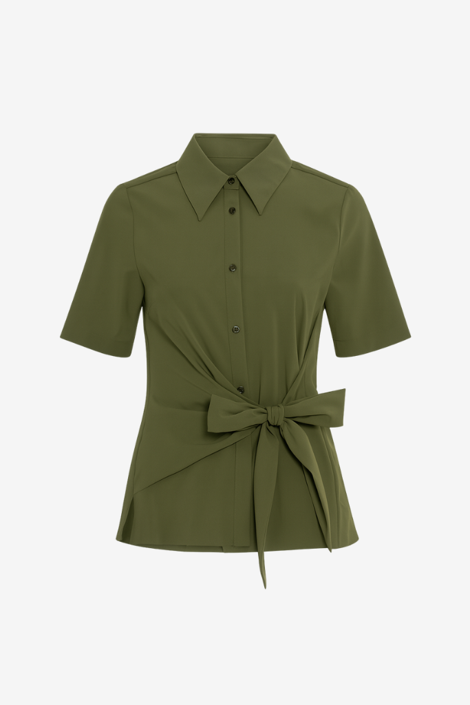 Create an accountThe La Salle Side Tie Wrap Shirt in green is an elegant blouse with a modern twist. Featuring short sleeves, a button-down front, and a feminine side-tie wrap, this shirt offers a flattering, tailored silhouette. Crafted from soft stretch fabric (75% polyamide, 25% elastane), it ensures all-day comfort and a polished look.