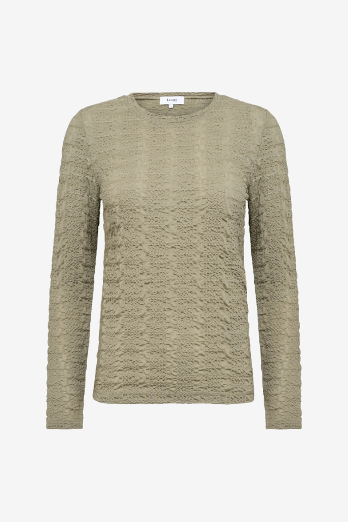 The Levete Room Kalle 1 T-shirt in Dark Moss is a durable long-sleeved, round neck shirt with subtle texture. Made from recycled polyester for comfort and style.
