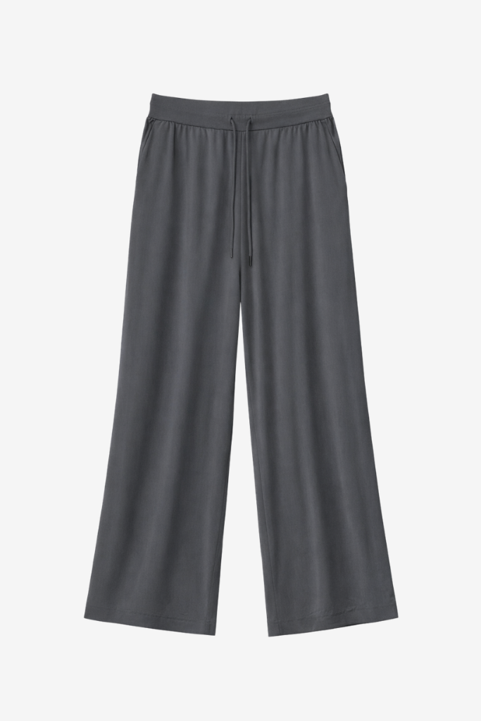 Crafted from a high-quality blend of capro and elastane, the fabric feels silky soft against the skin while providing natural stretch. The fluid drape enhances movement, while the elastic waistband with drawstring detail adds extra comfort and a modern touch.