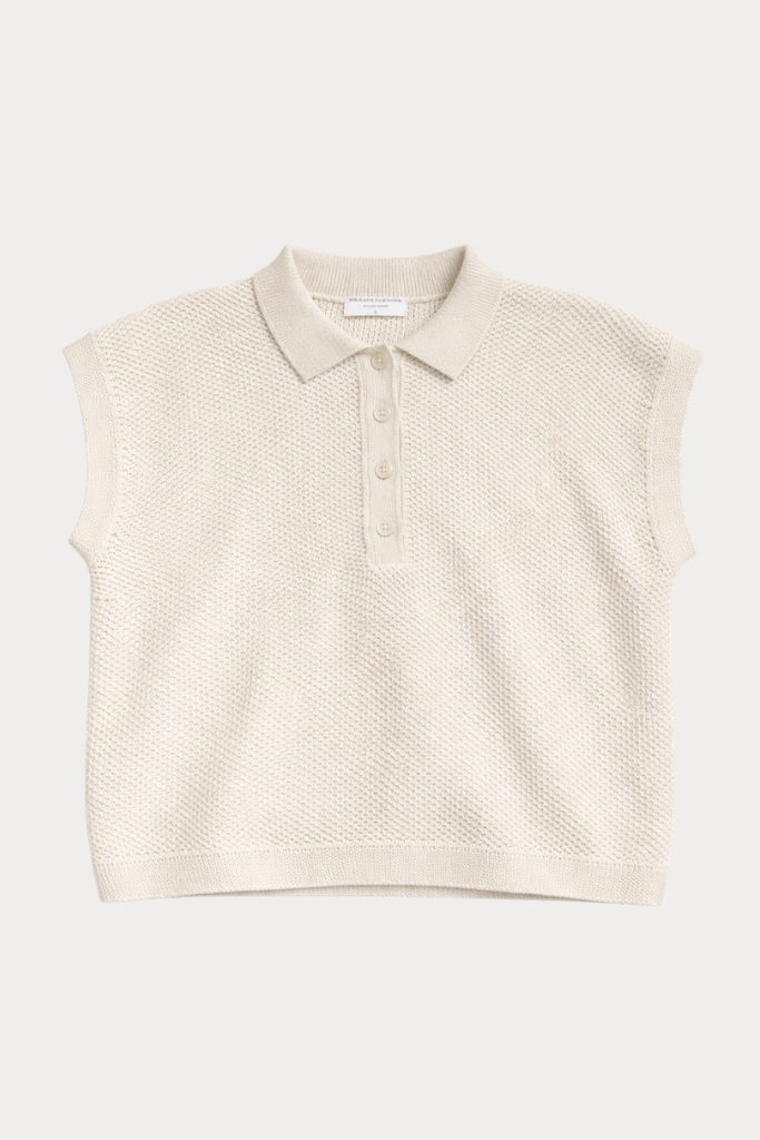 The sleeveless, slightly boxy fit combined with a classic polo collar and button closure creates a modern yet timeless silhouette. The fresh milk shade enhances its versatility, making it easy to pair with both neutral and contrasting tones.