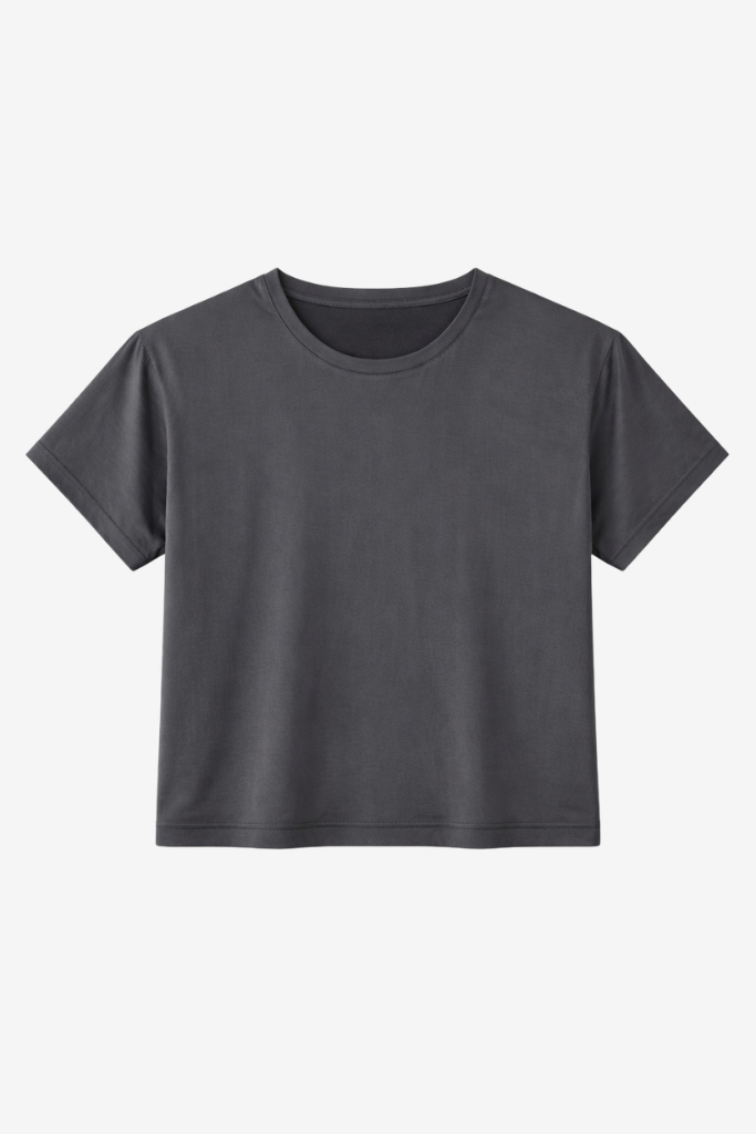 Crafted from a high-quality blend of capro and elastane, the fabric offers a silky-soft touch and comfortable stretch. It feels lightweight on the skin and drapes beautifully, making it suitable for both elegant and casual styling. The classic round neckline and short sleeves create a timeless silhouette.