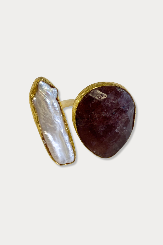 Create an accountThe RIVS Multi Color Ring with bordeaux stone and pearl is a striking accessory that merges elegance with boldness. Crafted from stainless steel, it features a deep bordeaux faceted stone and an elongated shimmering pearl.