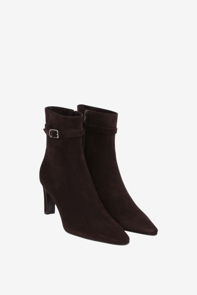 Create an accountThe Panara High Heel Buckle Boot Caffe is a sophisticated ankle boot with a warm and rich appeal. Crafted from soft suede and finished with an elegant silver buckle, this design is a refined addition to your wardrobe. The 7.5 cm heel enhances your silhouette with a feminine lift.
