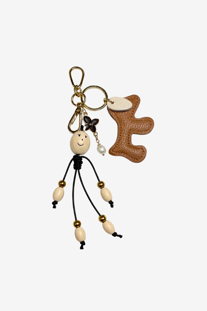 The design combines a minimalist doll with a charming dog-shaped detail in warm camel tones. The natural colors, gold accents and subtle pearl create a refined balance between playfulness and elegance.