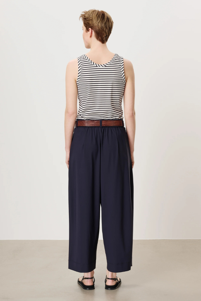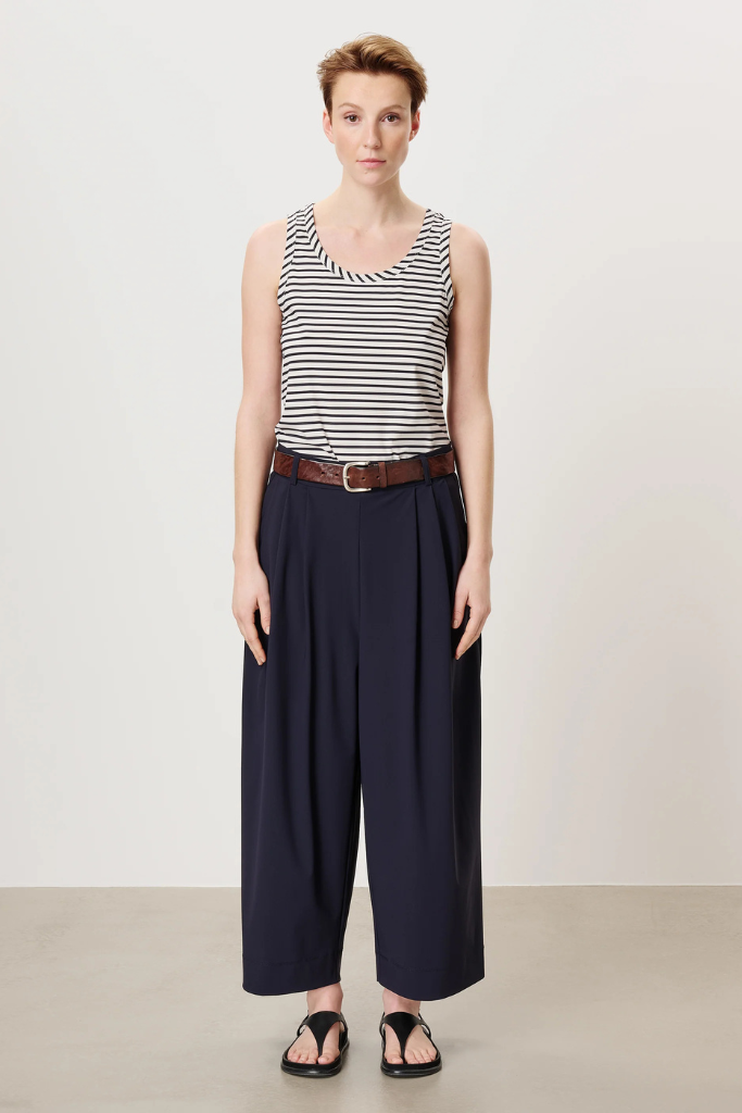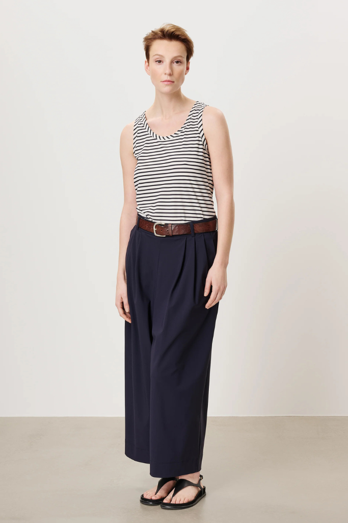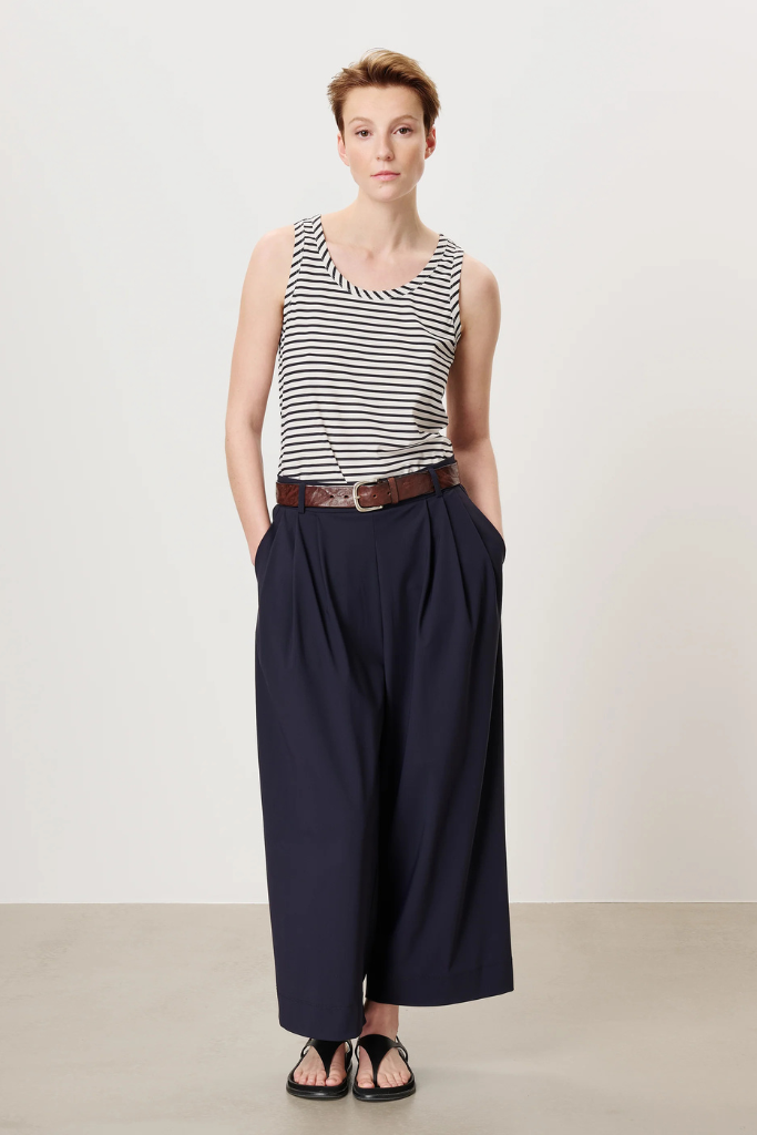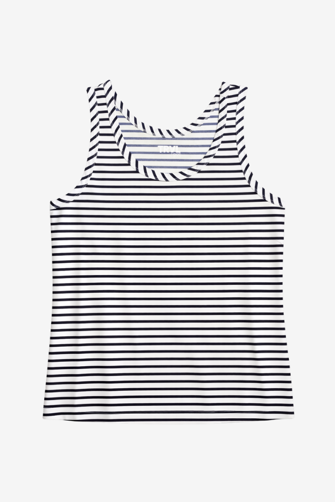 The classic ink blue and white stripe creates a fresh, stylish look that never goes out of fashion. Designed with a sleeveless silhouette and round neckline, it offers a feminine and flattering fit, ideal for layering under a blazer or cardigan. Fits true to size.