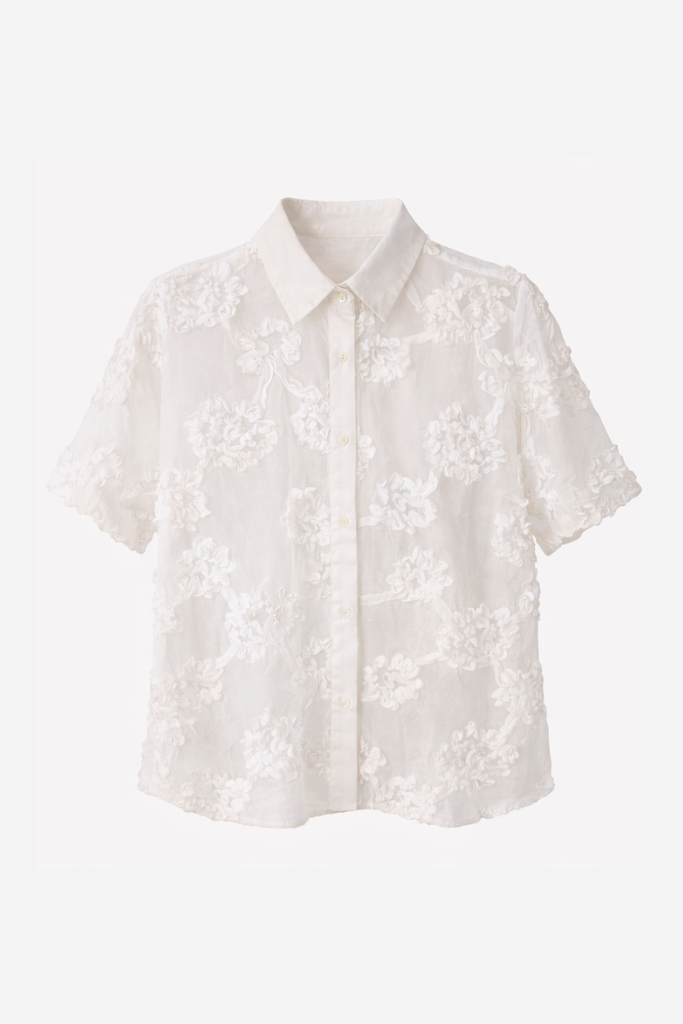 De katoenen stof voelt zacht aan en is licht doorschijnend, ideaal voor warme dagen. De korte mouw en losse snit zorgen voor extra draagcomfort, terwijl het verfijnde bloemdetail de blouse een vrouwelijke touch geeft. Combineer met een linnen broek of denim short voor een frisse en elegante zomerlook.