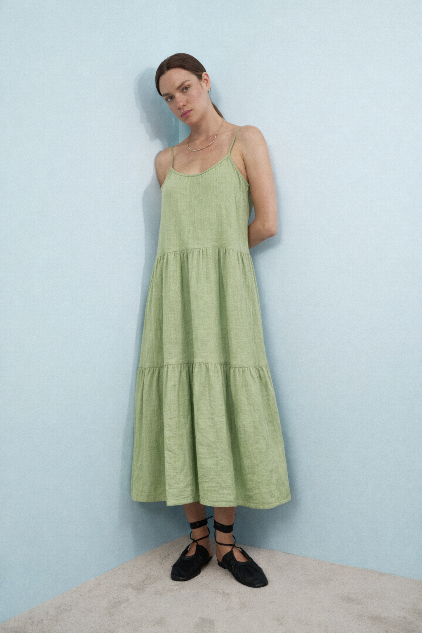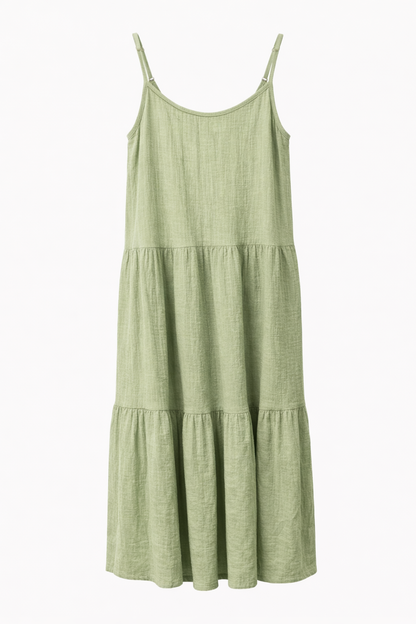 De licht gekreukte stof geeft de jurk een nonchalante uitstraling, terwijl de gelaagde rok zorgt voor een vrouwelijke touch. Draag met sandalen en een rieten tas voor een frisse, zomerse look.