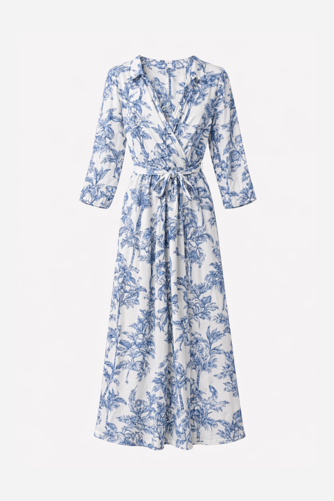 De 0039 Italy Julene lange jurk blauw – luchtige maxi wrap-dress van katoen met tropische print, flatterend en elegant voor zonnige dagen.