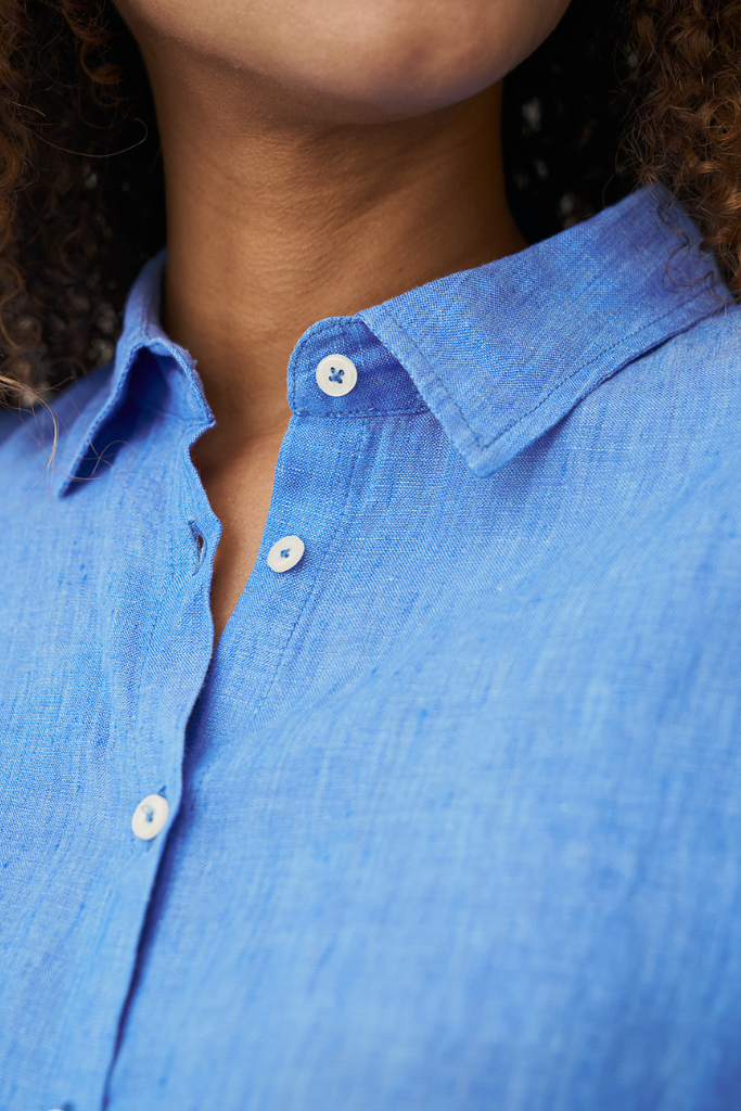 De diepe blauwtint straalt elegantie uit en is moeiteloos te combineren met lichte of neutrale tinten. Dankzij de klassieke kraag, lange mouwen en knoopsluiting is deze blouse geschikt voor zowel casual als zakelijke gelegenheden. Stijlvol en veelzijdig – van strand tot kantoor.