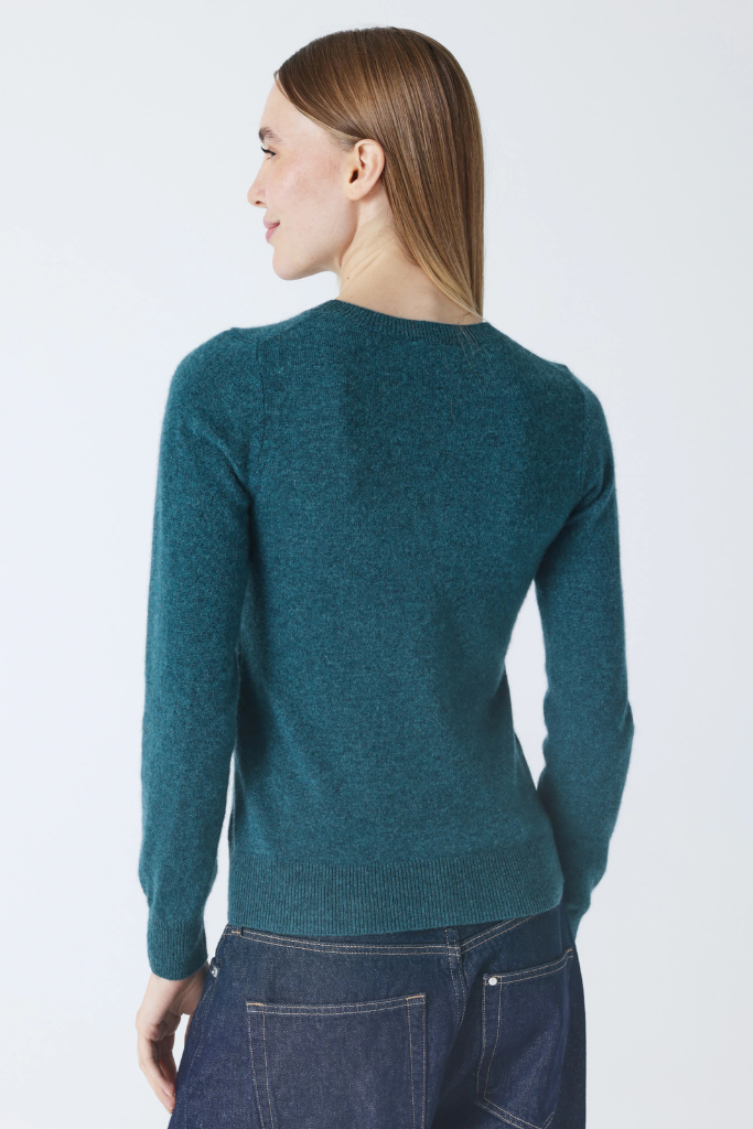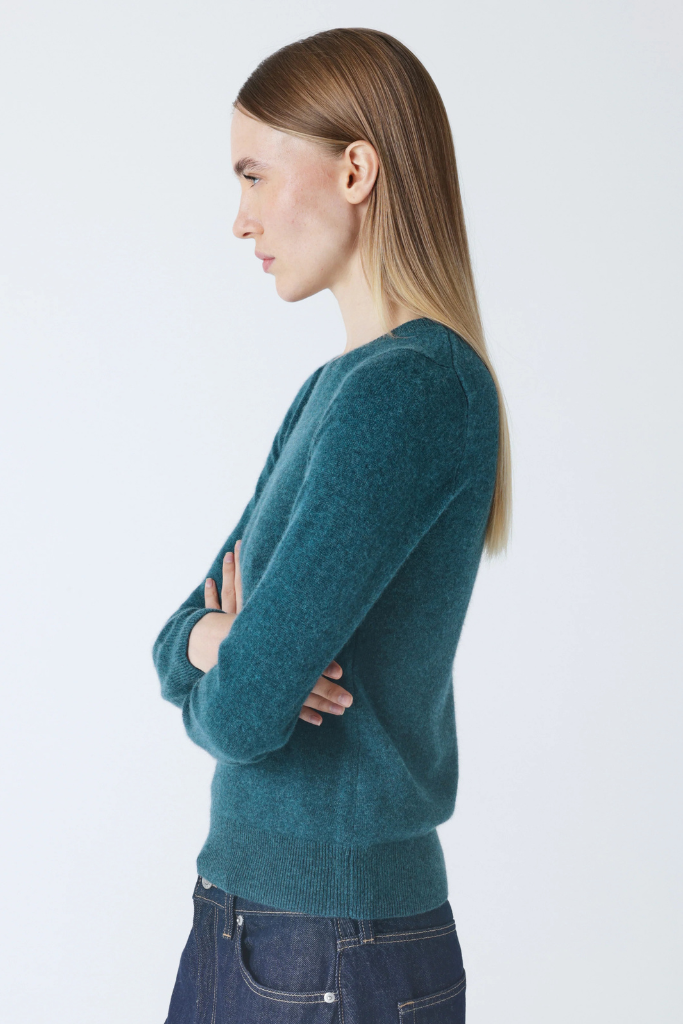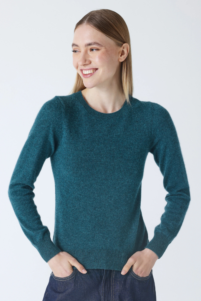De Absolut Cashmere Catelina Trui Heathered Teal is een fijngebreide trui van 100 % cashmere met ronde hals, aangesloten pasvorm en ribboorden. Tijdloos én elegant.