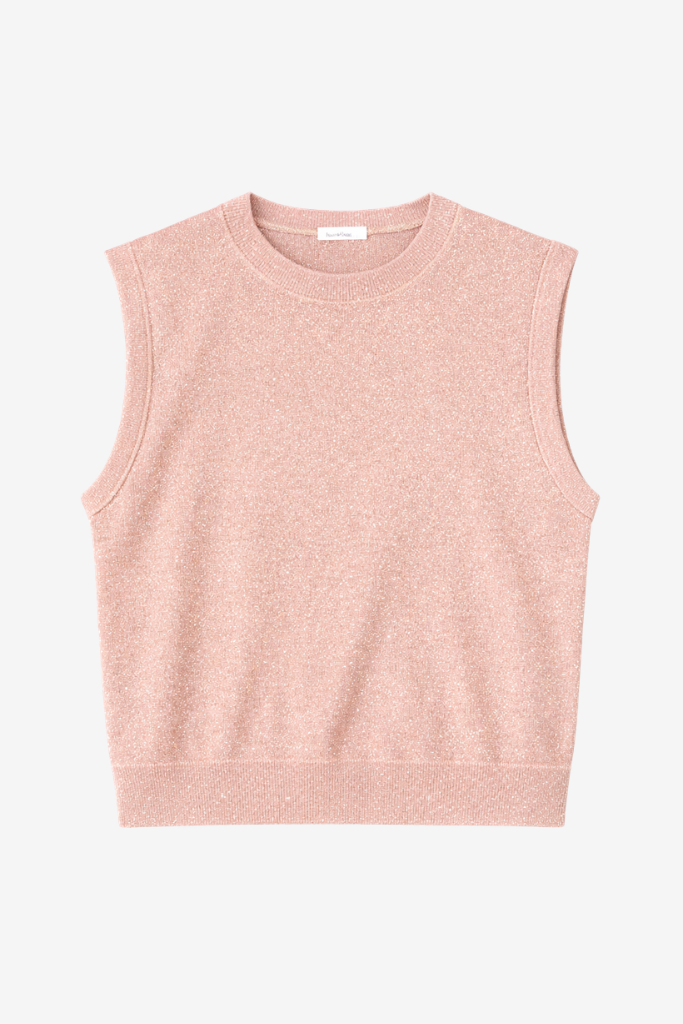De Absolut Cashmere Naomi Glitter Top Cloudy Pink is een mouwloze knit met subtiele glitters in zachtroze – vrouwelijk, luchtig en elegant.