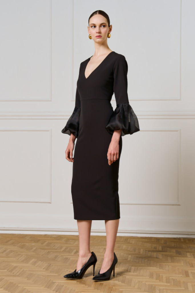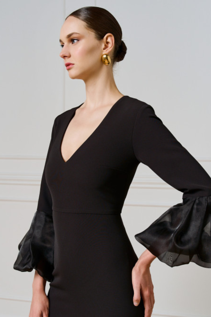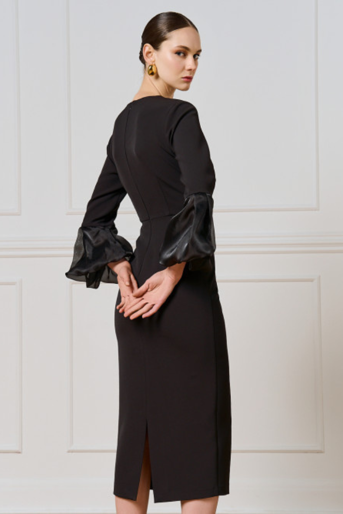 De ACCESS Jurk V-hals Zwart is een verfijnde midi-jurk met elegante ballonmouwen van organza en flatterende V-hals. Perfect voor een stijlvolle avondlook.
