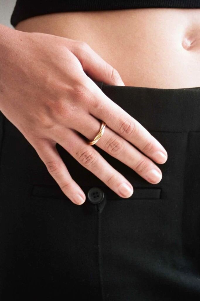 De drie banden zijn subtiel gefixeerd tot één vorm, wat deze ring tot een elegant en tijdloos accessoire maakt. Perfect om solo te dragen als minimalistisch statement, of te combineren met andere gouden sieraden voor een verfijnde look.