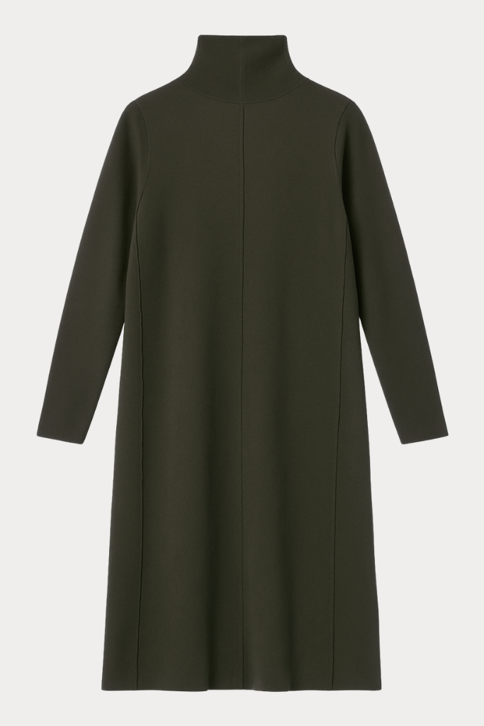 De jurk is vervaardigd van een zachte cashmere-blend, zoals gebruikelijk bij Allude. Ze heeft een kleine opstaande hals, lange mouwen en valt soepel vanaf de taille in een flatterende A‑lijn.De uitgesneden pasvorm benadrukt de taille en laat de rok elegant vallen — ideaal om de figuur te verlengen zonder volume.