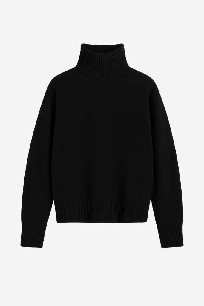 Deze trui is perfect te combineren onder een leren jas of met een klassieke pantalon voor een chique, comfortabele look. De tijdloze zwarte kleur maakt hem ideaal voor elke capsule wardrobe.