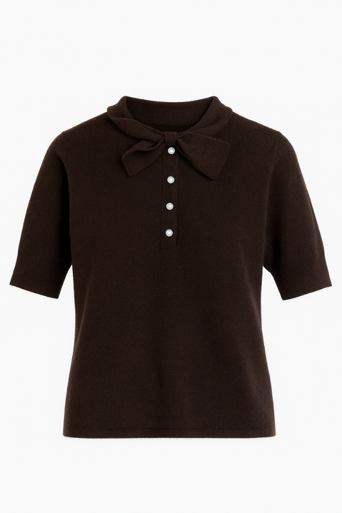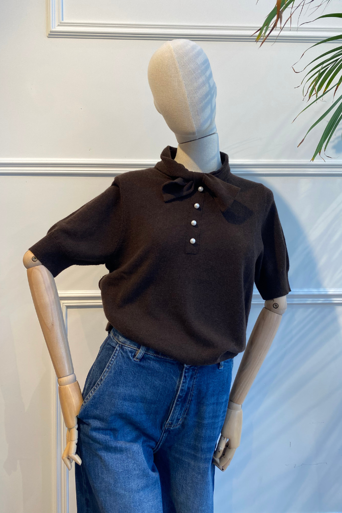 Bij de halslijn bevindt zich een elegante strik in dezelfde stof, met daaronder een subtiele rij parels die tot aan de borst loopt. De kortere, geplooide mouwen geven de trui een vrouwelijke flair, terwijl de ingetogen bruintint zorgt voor een tijdloze, veelzijdige uitstraling.