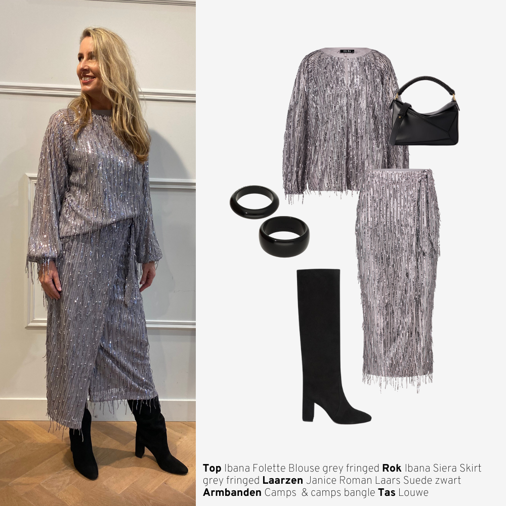 Met de pailletten rok en bijpassende top van IBANA ben jij gegarandeerd het stralende middelpunt van de avond. Shop de volledige look
