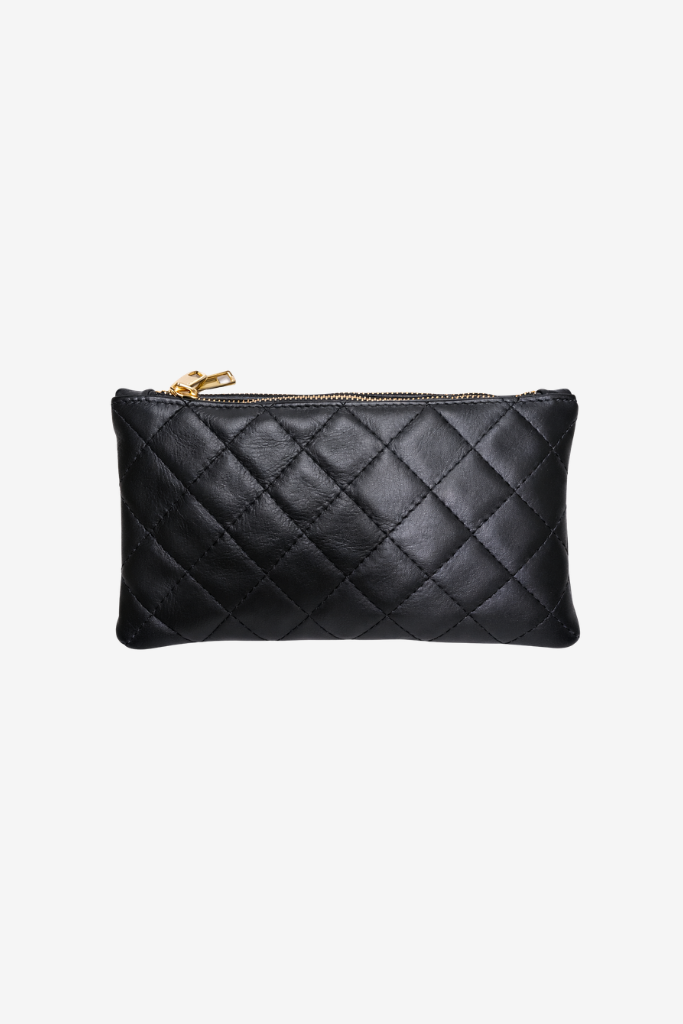 De tas is gemaakt van zacht zwart leer met een luxe doorgestikt patroon dat zorgt voor een tijdloze en verfijnde uitstraling. Aan de bovenkant bevinden zich twee gouden ritsvakken, ideaal om je essentials veilig op te bergen. Tussen deze vakken zit nog een extra compartiment met magnetische sluiting, waardoor je spullen overzichtelijk en snel toegankelijk blijven.