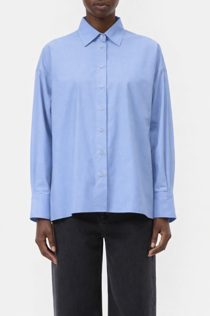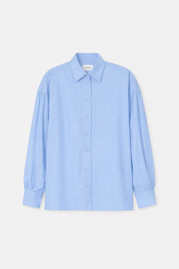 Account aanmakenDe Closed Cape Shirt Blouse in sky blue is een elegante en luchtige blouse, gemaakt van 100% katoen in hoogwaardige light cotton fil à fil kwaliteit. Door het fijne garenverfproces heeft de stof een subtiele textuur en een schone, verfijnde uitstraling. De relaxed fit met A‑shape en verlaagde schouders zorgt voor een moeiteloze, comfortabele pasvorm.