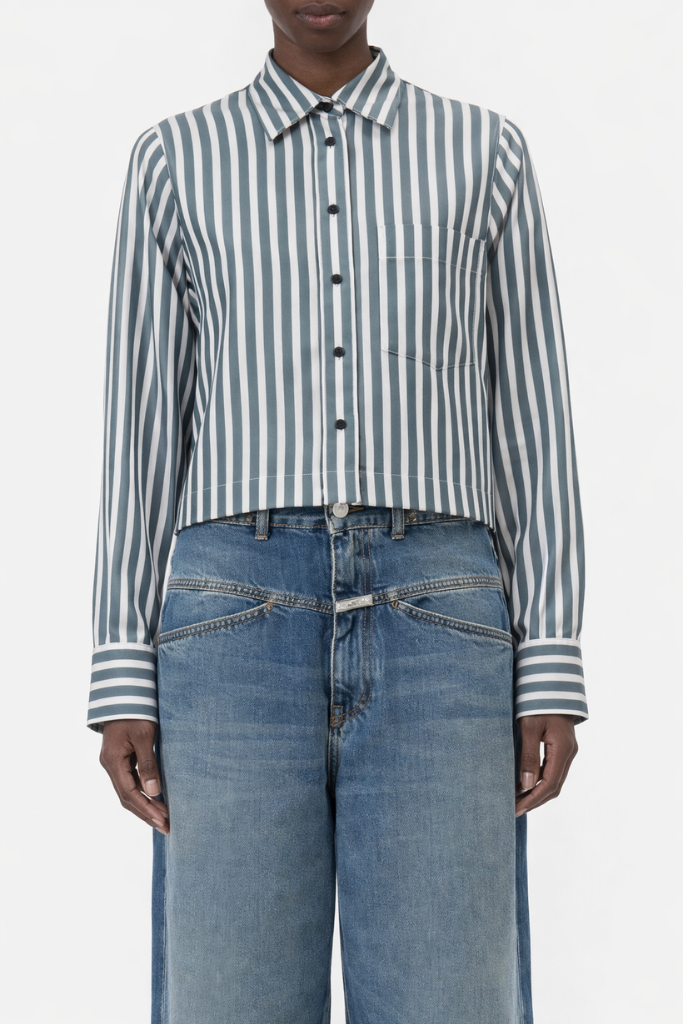 Account aanmakenDe Closed Cropped Classic Shirt in royal green stripe is een verfijnde blouse van 100% lyocell met een fijne tencel pyjama stripe en een comfortabele, luchtige feel. De stof is garengeverfd en geweven in Portugal, wat zorgt voor een rijke kwaliteit en subtiele textuur. De blouse heeft een regular fit met een rechte, cropped pasvorm, een klassieke kraag en een volle knoopsluiting met contrasterende knopen voor een chic detail.