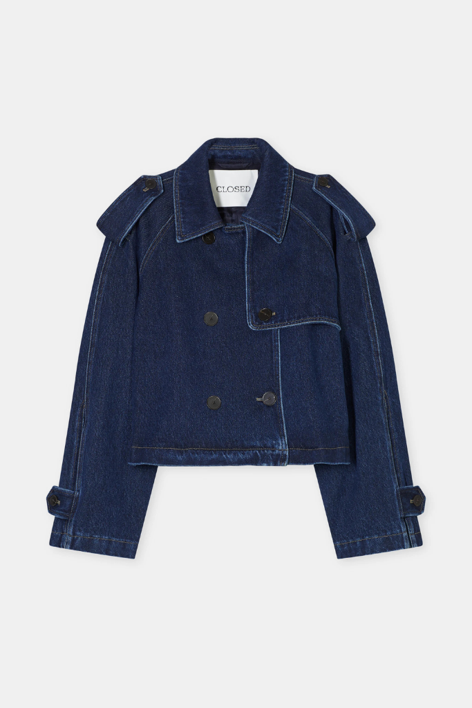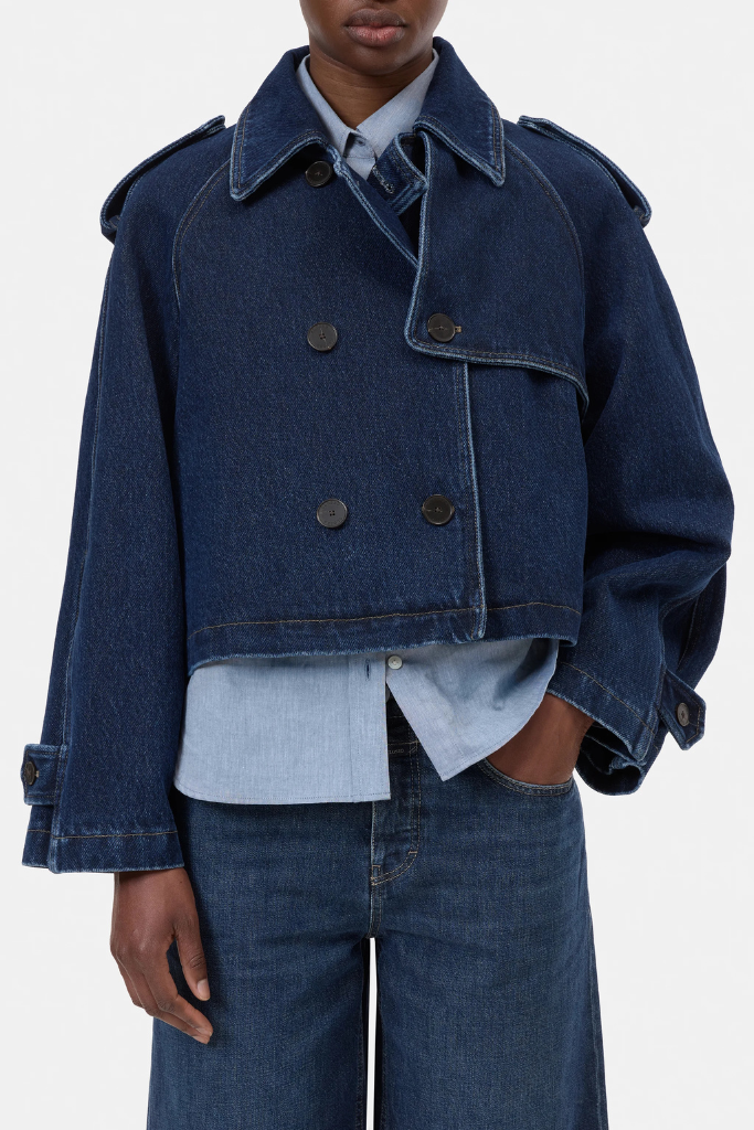 Account aanmakenDe Closed Cropped Trench in dark blue is een vernieuwende interpretatie van de klassieke trenchcoat. Vervaardigd van stevig 18 oz denim met een open twill-structuur, biedt deze jas een uitgesproken silhouet in een elegante A-lijn. De dubbele knopenrij, schouder-epauletten, asymmetrische rugpas en mouwtabs geven het ontwerp een moderne, gelaagde look. De cropped lengte zorgt voor een frisse twist en maakt het ideaal te combineren met high-rise jeans of een jurk.