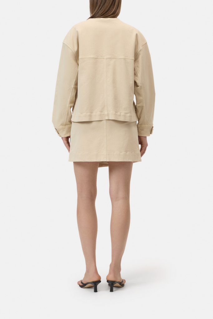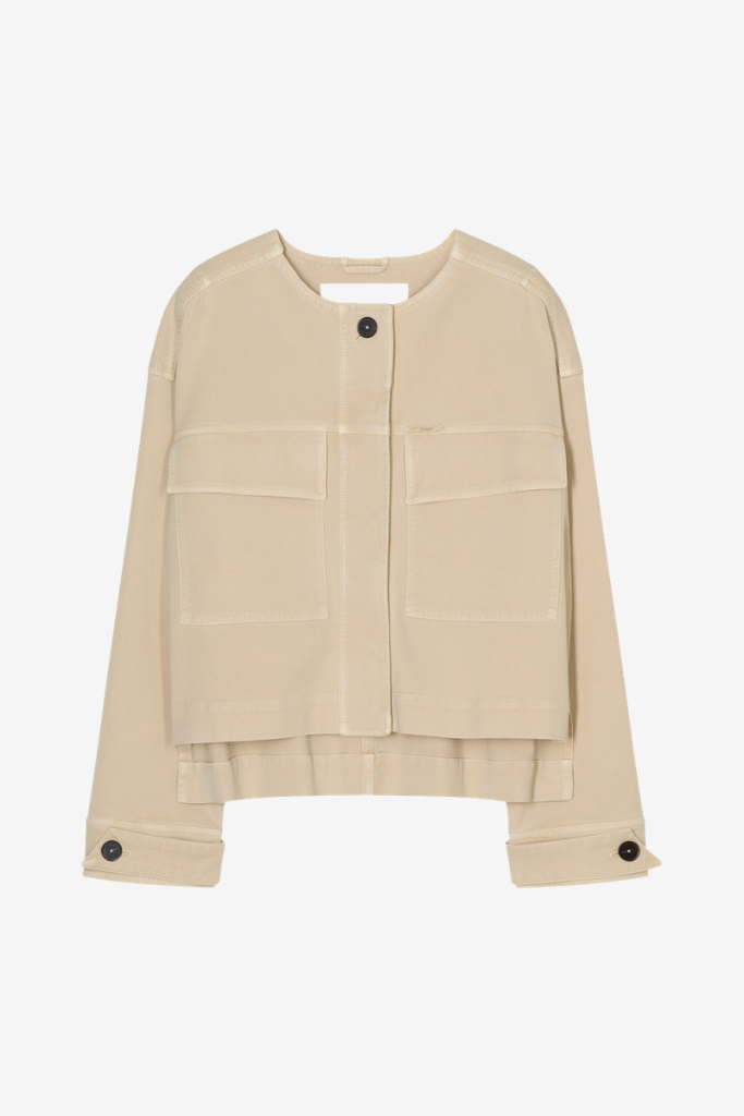 Gemaakt van een hoogwaardige lyocell-katoen stretch twill voelt de stof zacht aan en biedt het een subtiele flexibiliteit. De jas is voorzien van een kraagloze halslijn, een blinde knoopsluiting en kenmerkende borstzakken die zorgen voor een utilitaire, maar elegante touch. De lichte garment dye zorgt voor een subtiel gewassen effect en een rijke kleurbeleving.