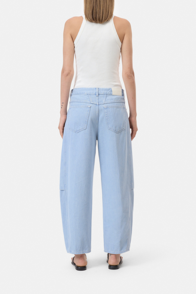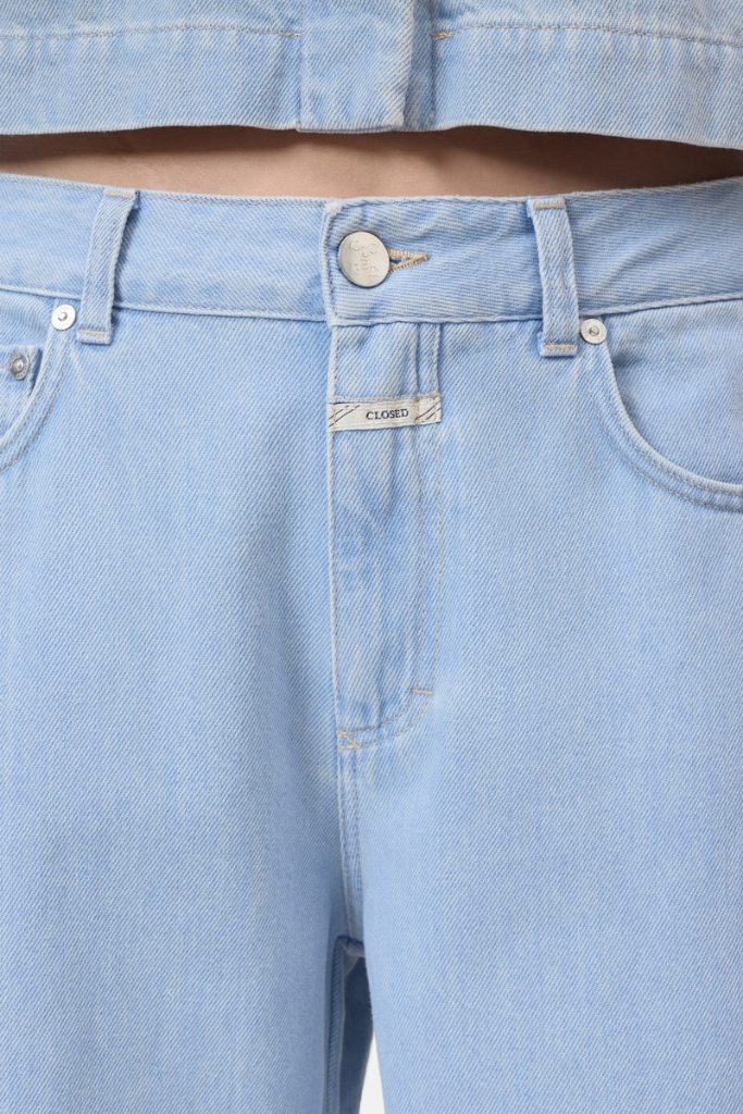 Gemaakt van een hoogwaardige mix van 80% katoen en 20% gerecycled katoen, voelt de stof stevig maar soepel aan. De lichtblauwe wassing zorgt voor een frisse, zomerse look die gemakkelijk te combineren is met zowel lichte tinten als contrastkleuren.