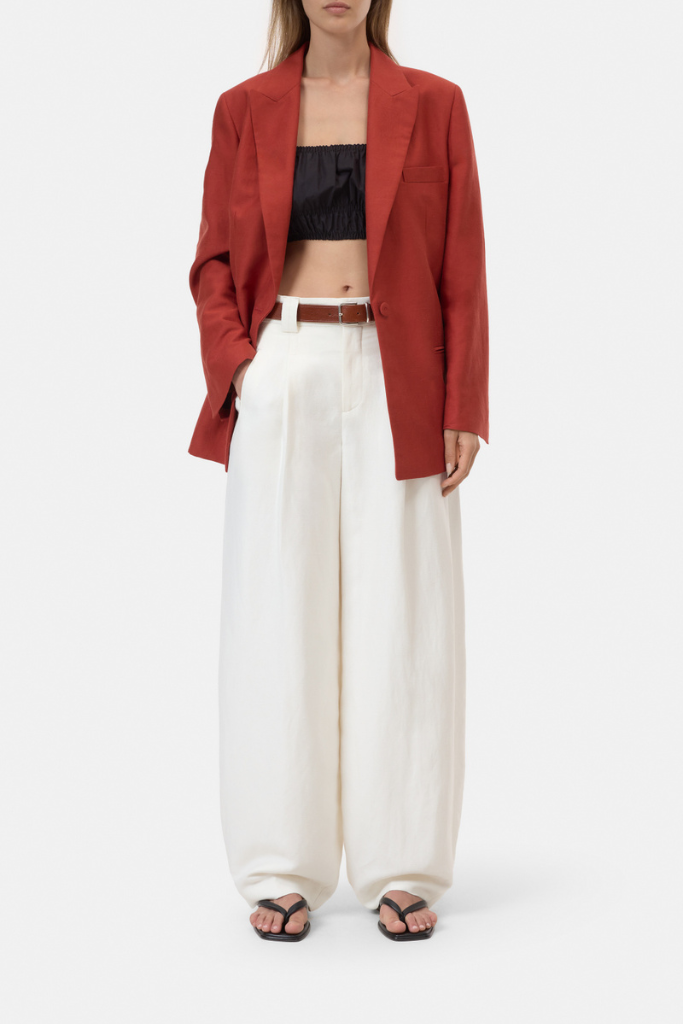 De broek is vervaardigd van een luxe linnen-viscose mix die het beste van twee werelden combineert: de natuurlijke, ademende structuur van linnen en de zachte, soepel vallende kwaliteit van viscose. Hierdoor voelt de stof licht en comfortabel aan, terwijl kreukvorming subtiel wordt verminderd. De unwashed look geeft het geheel een pure, ontspannen uitstraling.