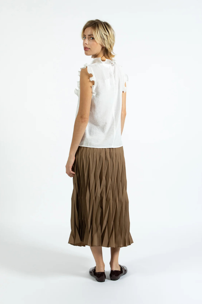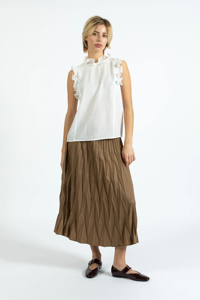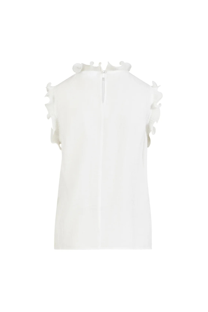 Deze top is veelzijdig: stijlvol met een getailleerde pantalon voor kantoor, of gecombineerd met een lichte rok en sierlijke sandaal voor een zomerse look. Het zachte, licht transparante materiaal creëert een verfijnde, natuurlijke uitstraling met subtiele ruches als blikvanger.