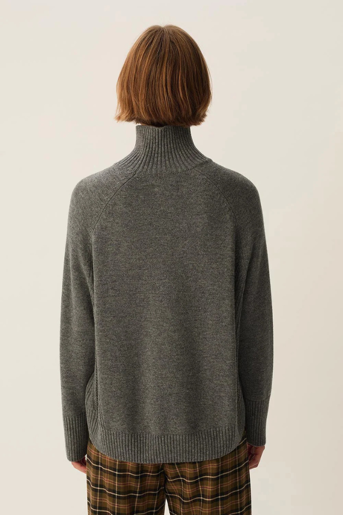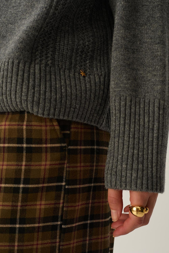Account aanmakenDe Des Petits Hauts Aramis Sweater in grijs is een ingetogen luxe basic voor het najaar en de winter. De trui is licht oversized, heeft een hoge col en brede ribboorden langs de mouwen, zoom en hals – alles in een zachte, warme merinomix (materiaal niet zichtbaar, vermoedelijk wol met kasjmier of synthetische vezels voor extra comfort).