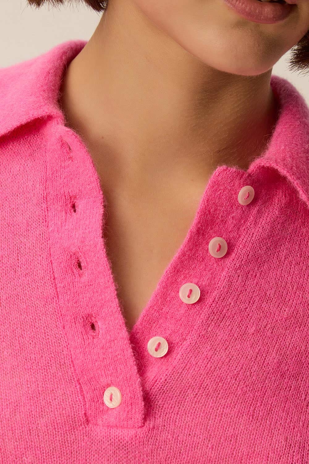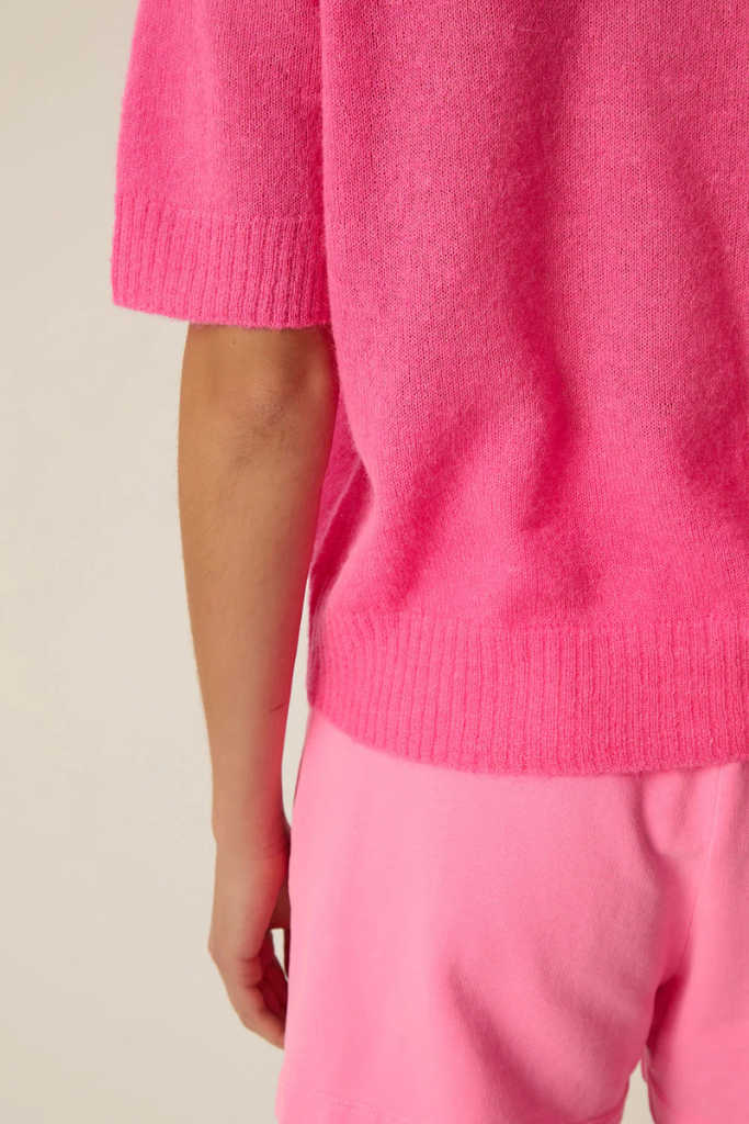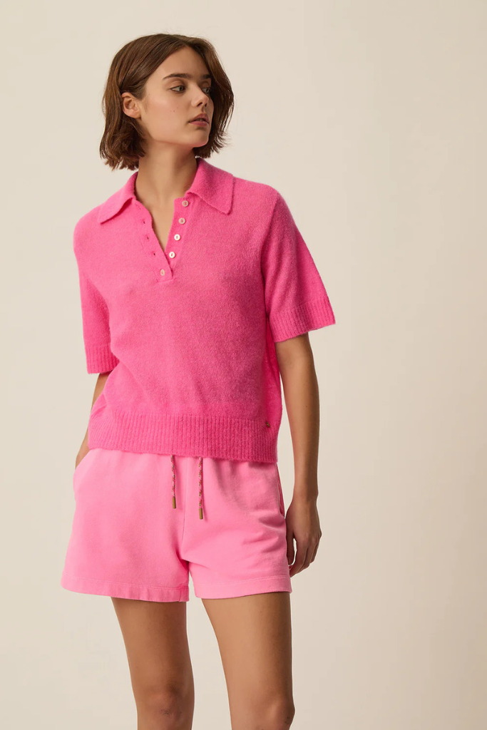 De Des Petits Hauts Cowboy Gebreide Polo fuchsia – een modern en verfijnd polo‑truitje in jersey‑breisel met korte mouwen, klassieke kraag en parelachtige knopen voor een sportieve, elegante look.