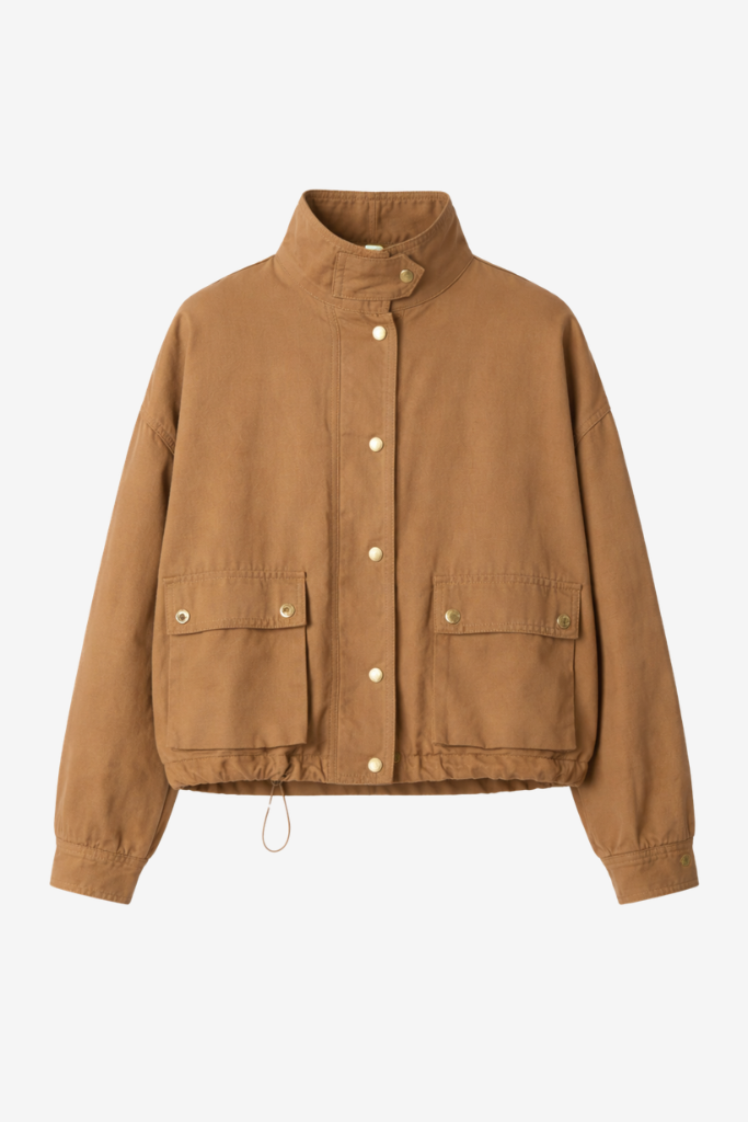 Het jack heeft een relaxed pasvorm met een licht cropped silhouet en een opstaande kraag, wat zorgt voor een moderne en nonchalante look. De goudkleurige drukknopen, de praktische borstzakken en de subtiele trekkoorddetails geven het ontwerp een verfijnde utility-inspiratie. Hierdoor krijgt het jasje een stoere maar elegante uitstraling.