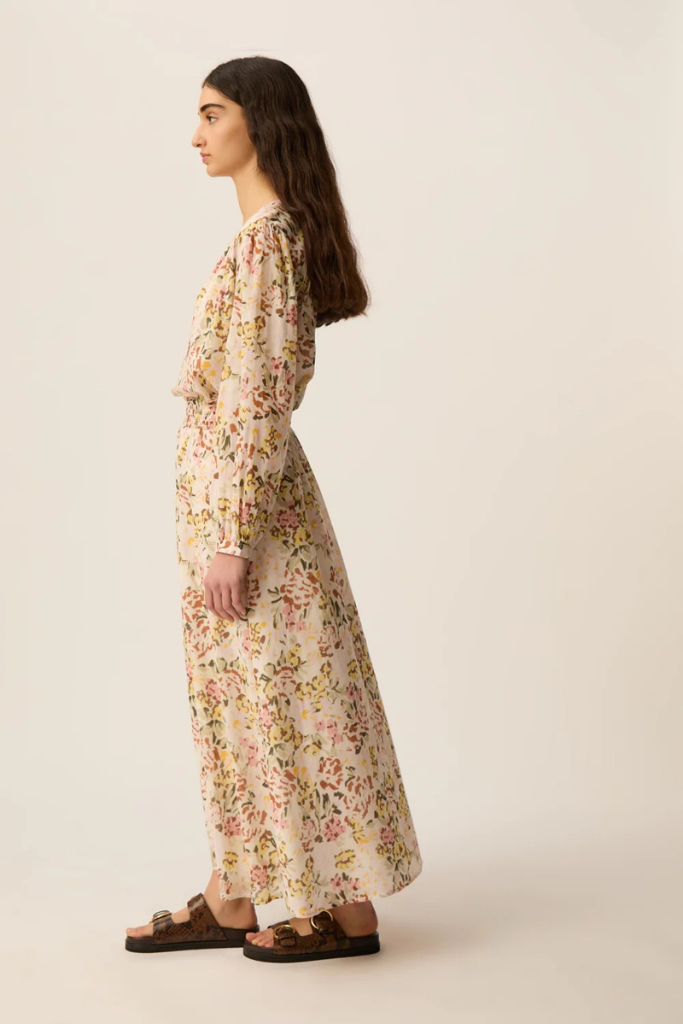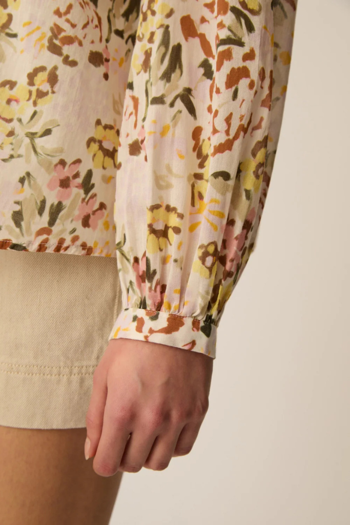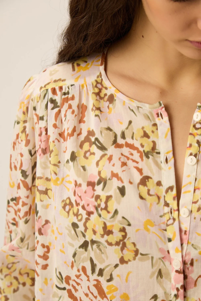 De Des Petits Hauts Roxane Blouse Bloem Verveine is een romantische blouse met een zachte bloemenprint en een elegante, luchtige uitstraling. De subtiele kleurencombinatie van warme verveine-, roze- en groentinten geeft het ontwerp een frisse en vrouwelijke look die perfect past bij het voorjaar en de zomer.