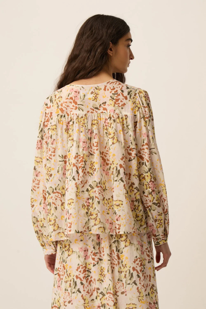 De blouse heeft een losvallende pasvorm met een ronde halslijn en een korte knoopsluiting aan de voorkant. De licht geplooide schouder- en rugdetails zorgen voor extra volume en een vloeiende beweging van de stof. De lange mouwen met manchetten geven het ontwerp een verfijnde en tijdloze uitstraling.